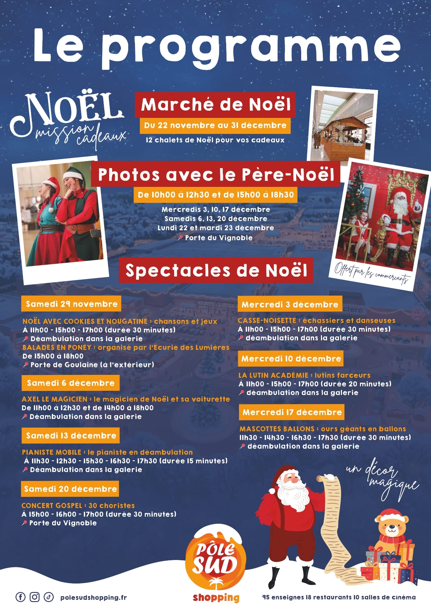 Et la féérie ne s’arrête pas là : un marché de Noël prendra place avec ses 12 chalets remplis de cadeaux, des spectacles merveilleux animeront les allées du centre les mercredis et samedis. Et bien sûr… le Père Noël en personne viendra à votre rencontre !